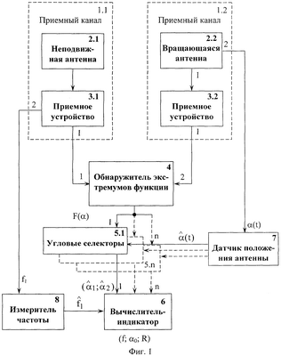 Устройство состоит из двух приемных каналов 1.1, 1.2. В первом приемном канале 1.1 неподвижная ненаправленная антенна 2.1 подключена к приемному устройству 3.1, а во втором приемном канале 1.2 – вращающаяся ненаправленная антенна 2.2 подключена к приемному устройству 3.2, линейные выходы приемных устройств 3.1; 3.2 подсоединены к соответствующим входам обнаружителя экстремумов функции 4, выход которого параллельно подсоединен к входам угловых селекторов 5.1…5.n., выходы которых подсоединены к соответствующим входам вычислителя-индикатора 6. При этом второй выход вращающейся антенны 2.2 через датчик положения антенны 7 параллельно подключен ко вторым входам угловых селекторов 5.1…5.n., а второй выход приемного устройства 3.2 через измеритель частоты 8 подключен ко второму входу вычислителя-индикатора 6.