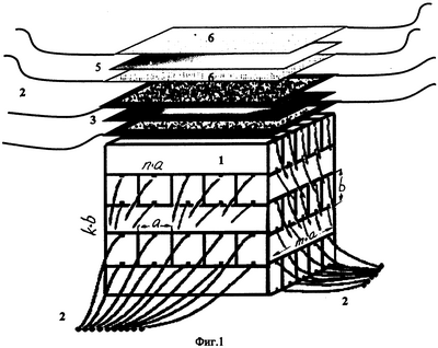 Стержни 1 имеют сечение а·b (а – ширина стержня, b – высота стержня), скомпонованы в блок размерами k·b – по высоте, n·a – по ширине и длиной m·а, где k – количество стержней по высоте пакета, n – количество стержней по ширине пакета, m – количество стержней по длине пакета, 2 – спектросмещающие волокна,