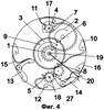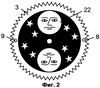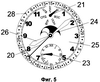 26. Способ по п.25, отличающийся тем, что используют средство движения, выполненное, например, в виде вращающегося с 24-часовым циклом и снабженное штифтом-толкателем суточного колеса и находящегося с ним в зацеплении с передаточным числом 59:1 колеса лунного календаря с 59 зубьями, выполненные с возможностью зацепления штифта-толкателя на суточном колесе при обороте суточного колеса за один из 59 зубьев колеса лунного календаря, вращения колеса лунного календаря и показа на шкале чисел соответствующего числа от 1 до 29 на секторе чисел четного лунного месяца или соответствующего числа от 1 до 30 на секторе шкалы чисел нечетного лунного месяца.