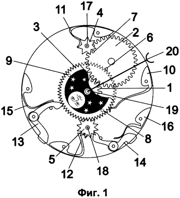 На фиг.1, 3, 4 приведено изображения предпочтительных, но не обязательных вариантов конструктивного исполнения устанавливаемого преимущественно в наручные или карманные часы механизма мусульманского календаря по изобретению, включающих: