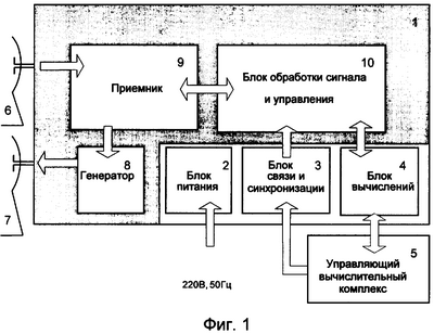 Блок 10 осуществляет первичную цифровую обработку сигнала, полученного из приемника 9, и передачу обработанного сигнала в блок 4 вычислений, из которого сигнал передается далее в управляющий вычислительный комплекс 5. Кроме указанных функций, связанных с обработкой сигнала, блок 10 производит управление и регулирование различных параметров компонентов приемника 9 в соответствии с командами управляющего вычислительного комплекса 5. С помощью блока 10 производится управление линиями задержки, счетчиками и аттенюаторами приемника 9.