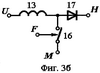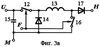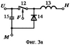 При значениях оптимального напряжения солнечной батареи 6 выше требуемого напряжения на нагрузке 10, либо оптимального тока солнечной батареи 6 ниже тока нагрузки 10, либо сопротивления нагрузки 10 ниже отношения оптимального напряжения солнечной батареи 6 к оптимальному току солнечной батареи 6 в качестве импульсного преобразователя напряжения 8 используется импульсный преобразователь напряжения понижающего типа (фиг.3а), содержащий ключевой элемент 12, дроссель 13, диод 14 и конденсатор 15. Первый вывод конденсатора 15 и первый силовой вывод ключевого элемента 12 соединены с выводом «U» импульсного преобразователя напряжения понижающего типа, второй вывод конденсатора 15 и второй вывод диода 14 соединены с выводом «М» импульсного преобразователя напряжения понижающего типа, второй вывод дросселя 13 соединен с выводом «H» импульсного преобразователя напряжения понижающего типа, второй силовой вывод ключевого элемента 12, первый вывод диода 14 и первый вывод дросселя 13 соединены между собой, управляющий вывод ключевого элемента 12 соединен с выводом «F» импульсного преобразователя напряжения понижающего типа.