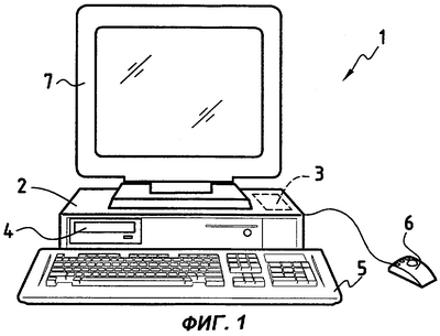 Компьютер 1 содержит обычные для устройств такого типа аппаратные средства. Более конкретно, компьютер содержит центральный блок 2, выполняющий последовательности команд программного обеспечения, соответствующего способу по изобретению, центральное запоминающее устройство 3, сохраняющее данные исполняемых программ, носители цифровых данных (жесткий диск, дисковод 4 для компакт-дисков, дисковод для гибких дисков и т.д.), обеспечивающие длительное хранение данных и программного обеспечения, периферийные устройства ввода (клавиатуру 5, мышь 6 типа «2D» или «3D», джойстик и т.д.). В состав компьютера входят также периферийные устройства вывода (экран 7, стереоскопические шлемы или очки и т.д.), обеспечивающие отображение перемещений сочлененного объекта.