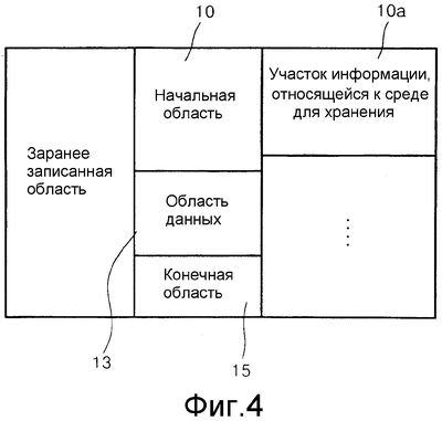 Способ модуляции записи данных, используемый во всей начальной области 10 или в части начальной области 10, то есть на участке 10а информации, относящейся к среде для хранения, может быть отличным от способа модуляции записи данных, используемого в остальной области среды для хранения информации. Например, способ бифазной модуляции может быть использован на всем протяжении начальной области 10 или только на относящемся к среде для хранения участке 10а начальной области 10, тогда как способ модуляции (RLL) с ограничением расстояния между переходами используют в остальной области среды для хранения информации.