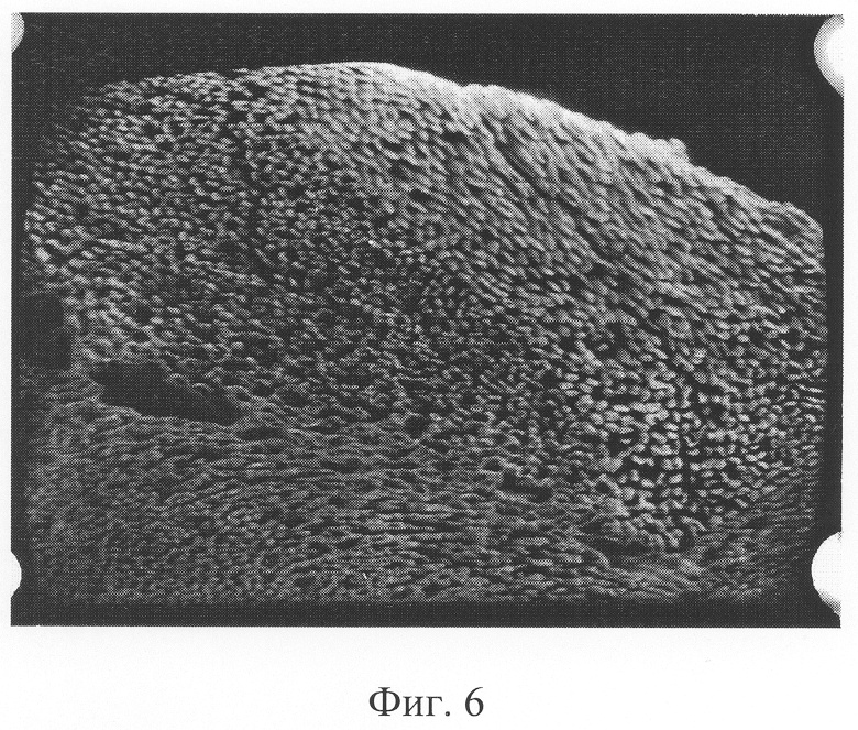 Катод 3 выточен из заготовки так, что нити образуют, как на поверхности, так и в объеме, угол 45° с его продольной осью. Эмитирующая поверхность катода 3 представляет собой двумерную матрицу острий из концов волокон, выступающих из монолитного образца на 70-100 мкм (фиг.6). Плотность упаковки волокон составляет 5·103 мм-2.