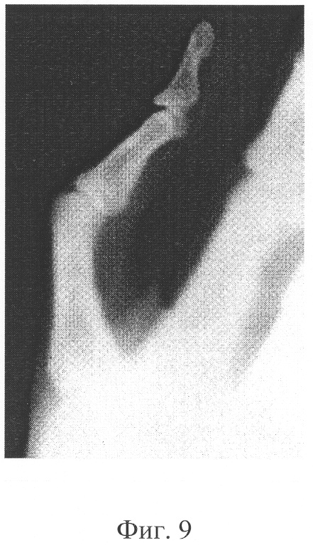При подаче на электроды трубки, а именно на анод 2 и катод 3, импульса напряжения с крутым фронтом происходит взрывообразное тепловое разрушение автоэмиссионным током микроострий, которые всегда имеются на эмиттерах. После окончания импульса напряжения на поверхности катода 3, практически мгновенно, застывает микроструктура, повторное приложение к которой достаточного электрического поля приводит к повторному акту взрывной электронной эмиссии с параметрами, полностью воспроизводящими предшествующий эмиссионный импульс. Как пример на фиг.9 представлен рентгеновский снимок руки с дефектом сустава большого пальца, полученный при подаче 40 импульсов длительностью 20 нс, напряжением U=35 кВ.