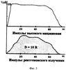 Проведенные нами опыты в указанных выше режимах (U<100 кВ, t<100 нс, j<105 А/см2), при диодных зазорах D<1,5 см, показали, что необходимая пауза между импульсами, не приводящая к пробою в диоде, составляет величину 10-6 с. Это значит, что частота повторения импульсов в группе может составлять F=1 МГц. Следовательно, при необходимости получения достаточной экспозиционной дозы, например в N=100 импульсов, при длительности одиночного импульса напряжения t=10-7 с, полное время экспозиции может составить Т=10-4 с, что вполне допустимо, даже для медицинской радиографии.