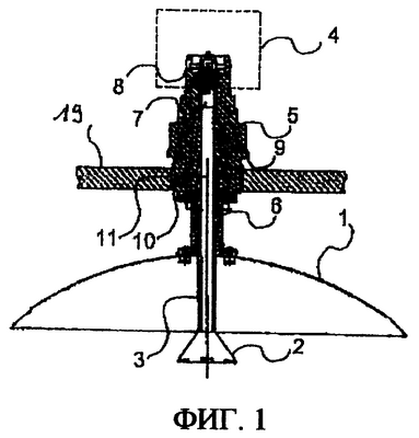 На фиг.1 изображено в качестве примера антенное устройство измерения уровня заполнения с параболической антенной для излучения или приема электромагнитных волн, особенно радиолокационных или микроволн. Параболическая антенна состоит из собственно тела 1 антенны, антенной трубки 3 и устройства 2, выполненного как передатчик и приемник. Тело 1 антенны известным образом состоит из параболического отражателя и имеет центральное проходное отверстие. Сквозь центральное проходное отверстие тела 1 антенны выступает в осевом направлении антенная трубка 3. На переднем конце антенной трубки 3 расположены передатчик и приемник 2. Передаваемые через антенную трубку 3 к устройству 2 передатчика и приемника волны направляются от передатчика и приемника на тело 1 антенны и от него посылаются в направлении передней стороны к загружаемому материалу в контейнере. В противоположном направлении отраженные от загружаемого материала волны фокусируются от тела 1 антенны на устройстве 2 передатчика и приемника и передаются от него на антенную трубку 3 для дальнейшей передачи.