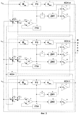 Источник напряжения смещения (ИНС) 11 вырабатывает на своих m выходах напряжения различной величины. Это напряжение с m-го выхода ИНС поступает на соответствующий вход блока управления 3 и смещает зону регулирования выходного напряжения соответствующим каналом СН. Номинальные значения напряжений смещения выбраны таким образом, чтобы обеспечить последовательную работу каналов СН (фиг.2а).