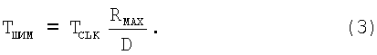 при этом относительная длительность (скважность) импульсов выходного сигнала широтно-импульсного модулятора UВЫХ(t) остается постоянной и определяется только соотношением входного сигнала UBX(t) широтно-импульсного модулятора и амплитуды пилообразного сигнала RMAX. Временная диаграмма, поясняющая работу устройства, приведена на фиг.2. На временной диаграмме приведены графики UВЫХ(t), UBX(t), UCLK(t), R(t) на интервале трех периодов работы широтно-импульсного модулятора. Величины D и ТШИМ различны для каждого периода в соответствии с работой генератора псевдослучайных чисел.