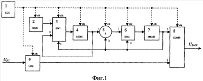 Генератор псевдослучайных чисел 2 (RND) формирует псевдослучайный числовой код D с равномерным распределением в некотором заранее заданном диапазоне DMIN-DMAX. Первый блок переключения 3 (SW1) передает значение этого кода в первый регистр памяти 4 (МЕМ1) в случае, если значение на его третьем входе не меньше заданного значения RMAX (амплитуда пилообразного сигнала), иначе в первый регистр памяти 4 (МЕМ1) записывается значение с второго входа первого блока переключения 3 (SW1) (выход МЕМ1). Первый блок переключения 3 (SW1) реализует следующую математическую зависимость: