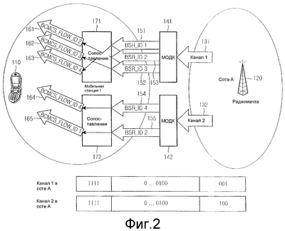 Мобильная станция 110 различает принимаемые Потоки, мультиплексированные по каналам 131 и 132, используя пару из одного BCMC_FLOW_ID и BSR_ID, сопоставленного с ним, в базовой станции 120, причем BSR_ID такой, что МОДК не должны перекрываться между каналами в соте А. Конкретно, мобильная станция 110 выбирает BCMC_FLOW_ID и BSR_ID, сопоставленный с ним, включенные в СПШУ от базовой станции 120, сопоставляет BSR_ID с BCMC_FLOW_ID и подает результаты сопоставления на ее верхний уровень. В данном случае, процесс сопоставления BSR_ID с BCMC_FLOW_ID не является процессом добавления новой информации или вновь выполняющимся сопоставлением, но процессом простой проверки комбинаций BCMC_FLOW_ID и BSR_ID, выполняемым базовой станцией 120. Информация сопоставления BCMC_FLOW_ID и BSR_ID принимается от базовой станции 120 при помощи СПШУ.