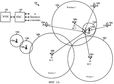 Фиг. 1 – схема системы 100 радиосвязи, которая использует ретрансляторы в соответствии с раскрытыми способом и устройством. Система 100 может быть сконструирована таким образом, чтобы соответствовать одному или более широко известным промышленным стандартам, таким как IS-95, опубликованным Ассоциацией промышленности средств связи/Ассоциацией электронной промышленности (TIA/EIA), и другим таким промышленным стандартам для систем, таких как W-CDMA, Ш-МДКР (широкополосный множественный доступ с кодовым разделением), cdma2000 или их комбинаций. Система 100 включает в себя ряд базовых станций 104. Каждая базовая станция обслуживает определенную зону 102 обслуживания. Несмотря на то, что на фиг. 1А для простоты изображены только три базовые станции с 104а по 104с, специалисты в данной области техники поймут, что обычно имеется значительно больше таких базовых станций в системе. Для цели этого раскрытия базовая станция и ее зона обслуживания совместно упоминаются как “ячейка”.