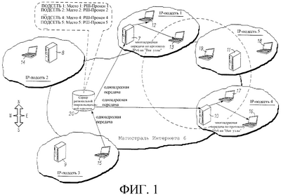 В предпочтительном варианте выполнения изобретения, показанном на фиг. 1, система связи использует магистраль Интернета, но изобретение также применимо к другим вариантам выполнения, в которых дейтаграммы посылаются по другим сетям. Сетевая система связи, показанная на фиг. 1, содержит IP-подсети 1-5, определенные общими элементами (битами в случае протокола IPv4 или префиксами в случае протокола IPv6) Интернет-адресов, присвоенных им. Подсети 1-5 отделены от магистрали Интернета простыми маршрутизаторами или шлюзами. В соответствии с этим вариантом выполнения настоящего изобретения с подсетями 1-5 связаны соответствующие прокси-серверы 7-11 подсетей. Прокси-серверы 7-11 предпочтительно напрямую соединены внутри подсети без маршрутизатора между ними; это позволяет использовать адрес «Все_узлы» протокола IPv6, например, для контакта со всеми узлами в этой подсети. Пользовательские терминалы, такие как 12-19, связываются с IP-подсетями 1-5.