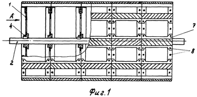 На фиг.1 изображен барабан молотильного устройства с расположением бичей в виде параллельных прямых на всю ширину барабана; на фиг.2 – вид А на фиг.1; на фиг.3 схематично изображен барабан с бичами, расположенными в виде «ступенек шевронного типа» уступом по направлению обмолота; на фиг.4 – в виде «ступенек шевронного типа» уступом против направления обмолота; на фиг.5 схематично изображен барабан в виде «ступенек» слева направо по направлению обмолота; на фиг.6 – справа налево по направлению обмолота; на фиг.7 и 8 схематично изображены барабаны «ступенчато-шевронного типа» уступом по направлению обмолота и наоборот.