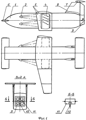 На фиг.1 изображен вариант ракетоносителя горизонтального взлета с возможным незначительным продвижением вперед при взлете с активным планирующим приземлением (шасси не показано). Предназначен для вывода на орбиту полезного груза. В РГВ входят система реактивного запуска и система аэродинамического приземления.