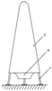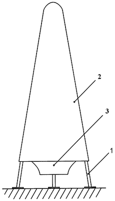 Техническая сущность предлагаемых опорных стоек взлетно-посадочных амортизаторов поясняется чертежом, где показана схема расположения стоек 1 на ракете-носителе 2 с центральным соплом 3 маршевой двигательной установки.