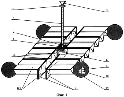 На обоих силовых поперечных элементах 7 поперечной вилко-образной балки установлены дополнительные электродвигатели положения 10, выходные валы которых соединены с силовыми торцевыми поперечными нервюрами 11, входящими в состав объемных трехгранных призм 12.