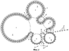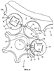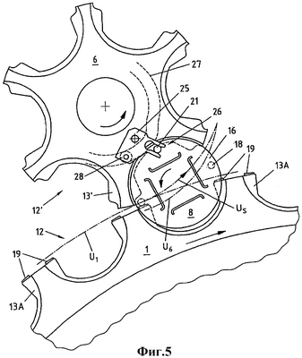 На фиг.5 показана «мгновенная фотография» выведения ячейковой клетки 8 из функционального колеса, в данном случае из колеса 1 для предварительного фальцевания, с помощью передаточного колеса 6. Здесь можно видеть, что установочный палец 18, правый на фиг.5, уже освободился от магнита. Однако в этом положении установочный палец 18 уже отошел от траектории вращения U6, проходящей вокруг центра передаточного колеса, а именно в результате поворота ячейковой клетки 8 внутри выемки 12′, обусловленного зацеплением поводковой вилки 26 управляющего элемента 25 вокруг поводкового штифта 21. Поворот управляющего элемента 25 в изображенном предпочтительном примере осуществления происходит с помощью криволинейного управления, причем под верхним краем передаточного колеса 6 жестко закреплена управляющая кулиса 27, по которой перемещается ползун 28, соединенный с управляющим элементом 25. Геометрическая форма управляющей кулисы 27 оптимизирована с учетом обеих «проблемных зон» извлечения и введения. Является очевидным, что управляющая кулиса 27 вращается даже если в целях лучшей наглядности изображена только ее часть. Траектория вращения установочных пальцев 18 вокруг колеса 1 для предварительного фальцевания обозначена U1. Очевидно, что при повороте ячейковой клетки 8 согласно изобретению переход с траектории вращения U1 на траекторию вращения U6 происходит не резко, а по управляемой кривой Us вращения. В целях большей наглядности не показан направляющий рельс 24 для принудительного наружного направления ячейковых клеток 8 в зоне расположения передаточного колеса 6.