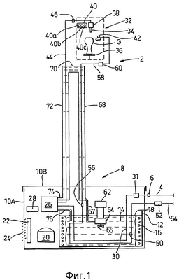 Трубка 50 для охлаждающей воды, которая может быть в форме кольца или петли, по меньшей мере, частью своей длины погружена в воду 14 и присоединена с одного конца к обычно открытому отсечному клапану 52, соединенному с подводом 54 воды при гидростатическом давлении питающей сети. Другим концом трубка 50 для охлаждающей воды подсоединена в месте 56 к гибкому водяному шлангу или трубке 58, поставляющей к соплу 42 охлажденную воду для распыления на внешнюю сторону стакана G для охлаждения последней, по мере того как вода льется по внешней стороне стакана. Обычно закрытый охлаждающий клапан 60 включен в трубку 58 и присоединен к системе управления, которая открывает охлаждающий клапан 60, когда требуется распыление охлаждающей воды. Детектор потока воды (не показан) предусмотрен для наблюдения за потоком воды от подвода воды 54, когда охлаждающий клапан 60 закрыт или система контроля считает, что клапан закрыт. При таких обстоятельствах такой поток воды ошибочен и не желателен, и может привести к излишку воды. Таким образом, когда детектор потока сигнализирует системе управления о том, что имеется поток воды, система управления работает таким образом, чтобы заставить клапан 52 закрыться и остановить любой поток воды в трубку 58 из подвода 54.