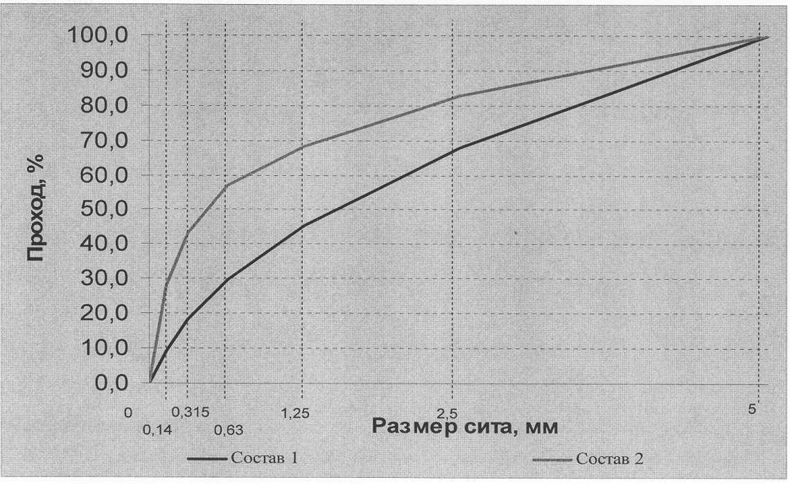 Предлагаемый фракционный состав пористого заполнителя из отходов производства ячеистого бетона является оптимальным для повышения водоудерживающей способности, увеличения прочности сцепления с ячеистобетонным основанием и снижения средней плотности раствора. Оптимальный фракционный состав был установлен экспериментально, для чего авторами был приготовлен и испытан ряд смесей с различным соотношением фракций пористого заполнителя. В результате испытаний установлено, что наивысшей водоудерживающей способностью, прочностью сцепления с ячеистобетонным основанием и наименьшей средней плотностью обладают растворы, у которых кривые просеивания пористого заполнителя лежат в определенном оптимальном диапазоне. Оптимальный диапазон кривых просеивания представлен на чертеже.
