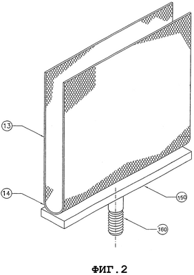 Фигура 3 показывает второй конкретный вариант выполнения анода в соответствии с данным изобретением, который не очень отличается от анода, изображенного ни фигуре 2. Его конструкция так же является открытой, позволяя заключить внутри нее катод; однако в данном случае электродная поверхность (13) образована двумя различными элементами, расположенными в вертикальном положении и прикрепленными к токоснимателю (150) соответственно по одному из краев (17). Устройство электродной поверхности (13) в основном такое же, как и в предыдущем варианте выполнения, при этом предпочтительным является применение перфорированных элементов, таких как листы или сетки, либо их наложение один на другой.