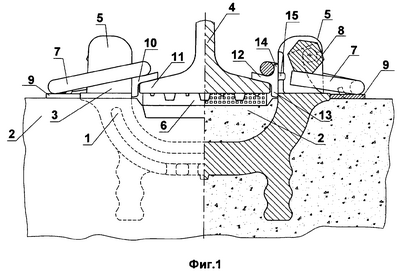 Сборка узла скрепления осуществляется следующим образом. На подрельсовую зону подрельсового основания 2 укладывают подрельсовую амортизирующую прокладку 6, далее располагают рельс 4, а между боковой гранью подошвы 11 рельса 4 и головкой 3 анкера 1 вставляют нарельсовые изолирующие прокладки 10 так, чтобы выступ 15 располагался между кронштейнами 5 внутри головки 3 над ее основанием, нижняя вертикальная полка 13 – между боковой гранью подошвы 11 рельса 4 и головкой 3 анкера, а нарельсовая полка 12 – на подошве 11 рельса сверху. Вплотную к основанию каждой головки анкера 1 на подрельсовое основание 2 укладывают подклеммные подкладки 9. Каждую пружинную клемму 7 опускают на соответствующую головку 3 анкера 1 сверху, располагая концевые усы между кронштейнами 5, при этом нашпальные скругленные участки клеммы 7 располагаются на подклеммной подкладке 9, а прямолинейная нарельсовая часть клеммы 7 располагается на нарельсовой полке 12 изолирующей прокладки 10. Верхняя вертикальная полка 14 препятствует касанию прямолинейной нарельсовой части клеммы 7 головок 3 анкера 1. Регулятор напряжения 8 размещают над усами клеммы 7 и заводят его ось в зацепление с кронштейнами 5, а затем путем поворота регулятора напряжения 7 на одну из граней регулируют натяжение клеммы 7.