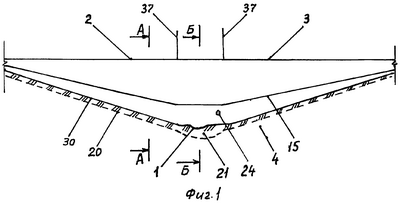 В указанных случаях на русловом участке 1 и на бортовых участках 2 и 3 замораживающие устройства выполнены преимущественно сезоннодействующими и автономными участками. При этом замораживающие трубы 18 выполнены воздушного вида, а замораживающие колонки – любого вида (вентиляторы и другое оборудование замораживающих устройств на чертежах не показаны).
