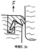 При дальнейшем, начиная с показанного на фиг.3а положения, закрывании створки 21 по мере постепенного ее приближения к коробке 23 не только сокращается ширина уплотняемого зазора Sp между ними, но и дополнительно имеет место относительное перемещение между створкой и коробкой в продольном направлении зазора Sp, а именно, с учетом приведенных на фиг.3а-3д изображений, створка 21 перемещается относительно неподвижной коробки 23 в показанном стрелкой F направлении. При таком относительном перемещении контактная поверхность 25 уплотняющей кромки 6 как бы смещается вниз вместе с наружной поверхностью 22 коробки 23 относительно створки 21, как это однозначно следует из рассмотрения последовательности отдельных стадий взаимодействия уплотнителя с уплотняемой поверхностью, проиллюстрированных на фиг.3а-3д. При таком смещении контактной поверхности 25 вниз, которое всегда рассматривается как происходящее относительно створки 21, уплотняющая кромка 6 изгибается вниз и одновременно в направлении створки 21. При этом происходит «свертывание» изогнутой уплотняющей кромки 6 в направлении опорного ребра 7 внутрь выемки 15, а свободно выступающий конец уплотняющей кромки 6 непрерывно приближается к опорному ребру 7 вплоть (или почти) до упора в него по достижении конечного положения (фиг.3д) при полностью закрытой створке. В этом положении выемка 15 оказывается практически полностью сомкнута, поскольку ее объем почти полностью оказывается заполнен свернутой уплотняющей кромкой 6. Однако по мере такого сворачивания уплотняющей кромки 6 постепенно исчезает и ее выпуклость над верхней поверхностью 9 головки 5 уплотнителя, что также наглядно показано на фиг.3а-3д. В соответствии с этим в конечном положении створки (фиг.3д) уплотняющая кромка 6 больше не выступает над верхней поверхностью 9 головки 5, и поэтому уплотнитель приобретает с его наружной стороны приятный внешний вид, поскольку он более не имеет выступающей над торцовой поверхностью створки (верхней поверхностью 9) выпуклой части и тем самым не имеет неэстетичных изломов.