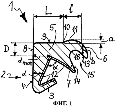 Нижняя поверхность 13 уплотняющей кромки 6 и верхняя поверхность 14 опорного ребра 7 переходят одна в другую, как показано на фиг.1 и 2, в вершине образованной ими выемки 15 по дугообразно изогнутой соединительной поверхности 16, образуя в результате в целом V-образное углубление со скругленным дном. Образованные нижней поверхностью 13 уплотняющей кромки и верхней поверхностью 14 опорного ребра боковые поверхности этой выемки 15 сходятся под острым углом (см. фиг.2). Боковые поверхности выемки предпочтительно выполнять плоскими, однако их можно также выполнять изогнутой формы.