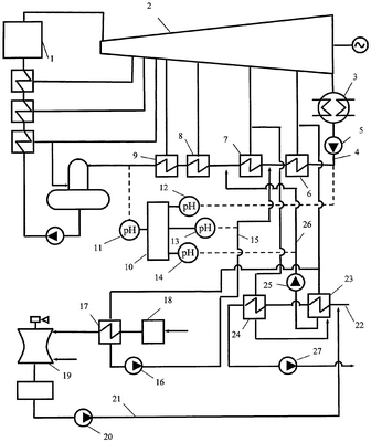 На чертеже изображена принципиальная схема тепловой электрической станции, поясняющая предложенный способ. Станция содержит котел 1, паровую турбину 2 с регенеративными отборами, конденсатор 3, трубопровод основного конденсата турбины 4 со включенными в него конденсатным насосом 5 и регенеративными подогревателями низкого давления 6, 7, 8, 9. В качестве устройства для проверки герметичности установлен многоканальный рН-метр 10, один датчик 11 которого установлен на трубопроводе питательной воды котлов, например, за четвертым подогревателем низкого давления 9, второй датчик 12 установлен на трубопроводе основного конденсата 4 за конденсатным насосом 5, третий датчик 13 установлен на конденсатопроводе 15 за конденсатным насосом 16 подогревателя исходной добавочной воды 17, а четвертый датчик установлен на трубопроводе конденсатопроводе 26 за конденсатным насосом 25 нижнего 23 и верхнего 24 сетевых подогревателей сетевой воды. Подогреватель исходной добавочной воды 17, водоподготовительная установка 18, вакуумный деаэратор 19 и насос добавочной воды 20 включены в трубопровод исходной добавочной воды 21, который связан с трубопроводом сетевой воды 22. В трубопровод сетевой воды 22, кроме сетевого насоса 27, также включены нижний 23 и верхний 24 сетевые подогреватели.