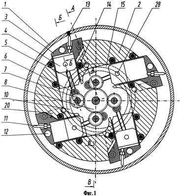 Заявленный двигатель внутреннего сгорания, представленный на фиг.1-4 состоит из корпуса 1, в котором установлен вращающийся блок цилиндров 2 с зазором и со смещением его центра 02 относительно центра 01 корпуса 1, ШКШСМ и СМПЦ. В блоке цилиндров 2 выполнены цилиндрические камеры, в которых установлены плавающие цилиндры 3 с поршнями 4. Каждый плавающий цилиндр 3, состоящий из гильзы и асимметричной головки, установлен с возможностью его возвратно-поступательного движения в соответствующей цилиндрической камере блока цилиндров 2, причем в каждой асимметричной головке размещены клапанный механизм 12 и свеча зажигания 11, срабатывающая (по принципу работы бегунка в распределителе зажигания обычного двигателя) от токораспределителя 13, установленного в отверстии корпуса 1. Токораспределитель 13 представляет собой изолированный высоковольтный контакт, к которому подключается провод высокого напряжения. Клапанный механизм 12 состоит из клапана наполнения 21 и клапана выпуска 25, срабатывающих при набегании роликов 24 на направляющие 23, установленные на внутренней цилиндрической поверхности корпуса 1. В асимметричных головках установлены патрубки 22, входящие аналогично поршням в каналы подачи топливно-воздушной смеси 16 в блоке цилиндров 2. Ось каждого плавающего цилиндра 3 наклонена и образует с осью шатуна 5, совпадающей с осью колена 6, установочный угол , а точка их пересечения, центр пальца 28, расположена на прямой, проходящей из центра блока цилиндров 2 под углом относительно его вертикальной оси (см. фиг.4б). ШКШСМ выполнен из шатунов 5, колен 6, на концах которых жестко закреплены шестерни 7 и 17, входящие в зацепление соответственно с неподвижными шестернями 8 и 9, установленными на корпусе 1. Передаточное отношение шестерней 7, 17 и шестерней 8, 9 принято равным двум. СМПЦ выполнен из силовых тяг 20, которые шарнирно закреплены пальцами 19 к асимметричным головкам плавающих цилиндров 3, опорных балок 18, обойм 15 и подшипников качения 10, при этом их центры совпадают с центром корпуса 1. В блоке цилиндров 2, для снижения сил трения при возвратно-поступательных движениях плавающих цилиндров 3, установлены опорные подшипники 14, контактирующие с цилиндрическими поверхностями их гильз. В корпусе 1 выполнено отверстие 26, вытянутое по окружности длиной, равной части длины окружности, проходящей клапаном выпуска 25 при такте «выпуск», через которое осуществляется выпуск отработанных газов в выхлопной коллектор 27.
