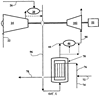 Горячие газы, выходящие из турбины 18 по линии 30, при температуре, близкой к 650°С, направляются затем в теплообменник 34, в котором они охлаждаются, нагревая наружный флюид, например воду, который входит в теплообменник по линии 36 и снова выходит по линии 38 в требуемом состоянии, например в виде водяного пара. Эти горячие газы находятся под давлением, например при давлении, близком к 4 бар.