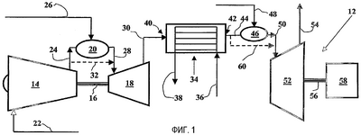 Устройство содержит также устройство обмена, в частности теплообменник 34, например трубчатый теплообменник с паровой камерой, через который протекает нагреваемый флюид, который входит по линии впуска 36 и снова выходит из этого теплообменника по выпускной линии 38. Теплообменник включает в себя подвод 40 горячих топочных газов, проводимых по линии 30. Эти горячие газы проходят через теплообменник 34, чтобы передать свое тепло нагреваемому флюиду. По завершении теплообмена горячие газы выводятся из теплообменника по отводу 42, связанному линией 44 с камерой дожигания 46, которая снабжается горючим по линии 48, причем это горючее может быть тем же, которое питает камеру сгорания 20. Камера дожигания 46 будет в дальнейшем называться нижней камерой дожигания, так как она расположена ниже устройства обмена 34, с точки зрения циркуляции горячих газов, выходящих из камеры сгорания 20. Горячие газы, полученные в результате дожигания смеси горючего и горячих топочных газов с линии 44, направляются по линии 50 на вторую секцию расширения с расширительной турбиной 52, которая включает в себя расширительную ячейку 12, откуда они снова выходят после расширения по линии 54. Эта турбина соединена через вал 56 с каким-либо устройством, производящим механическую и/или электрическую энергию, таким, например, как генератор 58 переменного тока. Как показано на фигуре 1, горячие газы, выходящие из теплообменника 34, частично проводятся по линии 44 в камеру дожигания 46, а оставшаяся часть этих газов направляется непосредственно к линии 50 отвода горячих газов дожигания по короткозамкнутой линии 60, работа которой станет ясна из дальнейшего описания.
