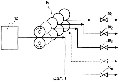 Как видно из этой схемы, система впрыска топлива турбомашины содержит N топливных форсунок, от 101 до 10N (из них на схеме показаны только четыре), расположенных в камере сгорания турбомашины. Эти топливные форсунки 101-10N питаются топливом от топливного бака 12. Единственное средство перекачивания топлива, или насосный блок 14 для топлива расположен между комплектом N топливных форсунок 101-10N и топливным баком 12 для отбора топлива из бака 12 и подачи к топливным форсункам N дозированных расходов топлива, предпочтительно одинаковых. Этот насосный блок 14 в ходе единого рабочего процесса осуществляет как перекачивание топлива из топливного бака, так и его нагнетание ко всем топливным форсункам. При этом нагнетание топлива производится таким образом, чтобы дозировать N расходов, подаваемых к топливным форсункам 101-10N.