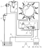 На чертеже приведена схема системы подачи топлива в авиационный двигатель внутреннего сгорания. Она состоит из топливного бака 1, электробензонасоса 2, топливного насоса (с механическим приводом) 3, фильтра 4, редукционного клапана 5, электромагнитного клапана 6, предназначенного для переключения подачи топлива с топливного коллектора 7 на дополнительную топливную магистраль 8. В обесточенном состоянии электромагнитный клапан 6 сообщает полость за редукционным клапаном 5 по топливной магистрали 8 с дозатором топлива 9. Дозатор 9 регулирует давление подачи в форсунке 11 одновременно с поворотом дроссельной заслонки 10. Излишки топлива, поступающего в дополнительную топливную магистраль 8 с форсункой 11 непрерывного действия, сливаются через дозатор 9 и магистраль 12 в топливный бак 1. В топливном коллекторе 7 установлены электромагнитные форсунки 13, включаемые по командам блока управления 14. Датчики основных (контролируемых) параметров (синхронизации и скорости 15, абсолютного давления за дроссельной заслонкой 16, температуры окружающего воздуха 17, температуры охлаждающей жидкости 18) снабжают блок управления необходимой информацией для определения длительности включения электромагнитных форсунок 13. Блок управления 14 включается тумблером 19, а электробензонасос 2 тумблером 20. В системе подачи топлива предусмотрены перепускные топливные каналы с обратными клапанами у электробензонасоса 2 и топливного насоса 3 и магистраль суфлирования 21 для удаления паровоздушных пробок из топлива.