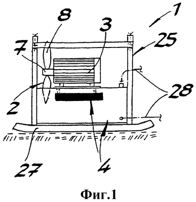 19. Установка по п.1, отличающаяся тем, что поплавок (4) образован рамным каркасом (25) с полыми балками (26) и/или коробами и при необходимости полозьями (27) для одной или нескольких лопастных машин (1).