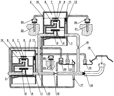 Включение в работу и срабатывание газовых регуляторов 1 происходит следующим образом: при закрытых кранах 15, 16 горелки 18 нажатием на пусковую кнопку 3 блока 2 контроля и регулирования регулятора 1 первой ступени осуществляют подачу газа на запальник 17, который зажигают. Газ одновременно через дроссель 11 и канал 12 поступает в надмембранную полость 6, где происходит повышение давления при закрытии сопла биметаллической пластиной датчика пламени 13 от пламени запальника 17, при закрытых соплах датчика тяги 14 и сопла датчика терморегулятора 26, терморегулятора 23, при этом мембрана 7 перемещается вниз и двухпозиционная заслонка 8 перемещается с дренажного сопла 9 на сопло 10 источника давления, происходит опорожнение надмембранного пространства клапана 4, мембрана с жестким центром с этим клапаном 4 отходит от седла 5, одновременно с закрытием сопла датчика пламени 13 открывается сопло датчика сетевого газа 20, газ поступает через это сопло в запальник 17, пусковую кнопку 3 отпускают, запальник 17 продолжает гореть, и в канал 12, надмембранную полость 6 через дроссель 12 поступает газ. Открывая кран 15, осуществляют подачу газа на первую ступень горелки 18. Одновременно газ поступает в регулятор 1 второй ступени, и, если сопло датчика терморегулятора 24 терморегулятора 21 и сопло датчика терморегулятора 25 терморегулятора 22 закрыты, открывая кран 16, включают вторую ступень горелки 18, которая работает на полную мощность. При нагреве системы отопления до установленной терморегулятором 21 температуры сопло датчика терморегулятора 24 открывается, в надмембранной полости 6 регулятора 1 второй ступени скачкообразно уменьшается давление. Мембрана 7 перемещается вверх, двухпозиционная заслонка 8 перекладывается с сопла 10 источника давления на дренажное сопло 9, происходит заполнение надмембранного пространства клапана 4, клапан 4 опускается на седло 5, подача газа через регулятор 1 второй ступени прекращается, ступень выключается из работы. То же происходит и при открытии сопла датчика терморегулятора 25 терморегулятора 22, настроенного на выключение второй ступени регулятора 1 при положительной температуре наружного воздуха, при этом первая ступень горелки 18 стабильно работает, так как терморегулятор 23 с датчиком терморегулятора 26 настроены на предельно допустимую температуру теплоносителя в котле. При снижении температуры сопло датчика терморегулятора 24 терморегулятора 21 закрывается, газ через канал 12, дроссель 11 заполняет надмембранную полость 6, если закрыто сопло датчика терморегулятора 25 терморегулятора 22, мембрана 7 перемещается вниз, двухпозиционная заслонка 8 перекладывается с дренажного сопла 9 на сопло 10 источника давления, происходит опорожнение надмембранного пространства клапана 4, который отходит от седла 5, подача газа через второй регулятор 1 возобновляется, при этом первая ступень горелки 18 работает постоянно. Так как регуляторы 1 первой и второй ступени одинаковы, то при открытии сопел датчика тяги 14 датчика терморегулятора 26 терморегулятора 23, подача газа или прекращается, или возобновляется при закрытии сопел этих датчиков, причем подача газа прекращается и во вторую ступень горелки 18 и восстанавливается также и для второй ступени горелки 18, при этом запальник 17 горит и в каналы 12 дросселя 11 продолжает поступать газ, вмешат