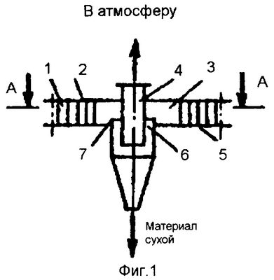 Пневмосушилка комбинированная спирально-вихревая для термолабильных материалов содержит спиральный канал 1, сверху и снизу герметично закрытый соответственно крышкой 2 и днищем 5 с образованием вихревой камеры 3, имеющей тангенциально расположенный к виткам спирального канала 1 входной патрубок 8 для подачи через него влажного продукта в смеси с воздухом. Число витков n спирального канала лежит в оптимальном диапазоне от 4 до 6. С вихревой камерой 3 жестко связана и соосно с ней расположена циклонная (сепарационная) камера 6 с переливным порожком 7, жестко закрепленным в днище 5 вихревой камеры 3. Выхлопной патрубок 4 расположен соосно циклонной камере 6 и проходит через вихревую камеру 3 герметично, т.е. не соединяясь с ней аэродинамическими потоками. На днище 5 вихревой камеры 3 закреплен вибратор (на чертежах не показан) для улучшения гидродинамики процесса, удаления налипшего на стенках спирального канала 1 влажного или неготового продукта. Вибратор может быть закреплен также на крышке 2 вихревой камеры 3 или непосредственно на стенке спирального канала 1 (на чертежах не показано). Оптимальными параметрами для вибрационной обработки являются уровень вибрации в диапазоне 70…85 дБ, частота колебаний в диапазоне 31,5…125 Гц, время воздействия 5 сек с интервалом 30 сек.