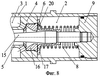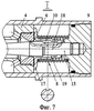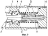 В приведенных на фиг.6, 7, 8 и 9 вариантах в штоке 5 выполнена полость 14, в которой установлено веретено 15, переменный дроссельный канал 6 образован внутренней поверхностью регулирующего кольца 16 и наружной поверхностью веретена 15. На фиг.6 и 7 приведен вариант выполнения запорного элемента в виде втулки 17, подпружиненной пружиной 8 относительно крышки 9 цилиндра 1, установленной на одном конце веретена 15 и охватывающей его. При этом дополнительный дроссельный канал 10 образован внутренней боковой поверхностью 18 канала втулки 17 и наружной поверхностью 19 веретена 15. На фиг.8 приведен вариант выполнения тормоза веретенного типа с дополнительным дроссельным каналом в виде отверстий 20 во втулке 17, на фиг.9 – в виде отверстий 21 в веретене 15. На втором конце веретена выполнена полость 22, которая соединяется с полостью 14 штока 5 отверстиями 23 и 24. Отверстия 23 перекрываются клапаном-модератором 25 тормоза наката. Клапан-модератор 25 делит полость штока 5 на две полости 14 и 26.