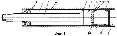 После выстрела при откате в варианте на фиг.1 и 2 поршень 4 вместе со штоком 5 перемещается относительно цилиндра 1 влево по чертежу. При этом рабочая жидкость из штоковой полости 3 пробрызгивается через переменный дроссельный канал 6 и отверстия 27 в поршне 7 в поршневую полость 2, создавая гидросопротивление движению поршня 4 и соединенным с его штоком 5 откатным частям орудия (не показаны), тормозя их откат. Параметры торможения отката определяются параметрами переменного дроссельного канала 6. При накате поршень 4 со штоком 5 перемещается относительно цилиндра 1 вправо по чертежу. При этом рабочая жидкость пробрызгивается через переменный дроссельный канал 6, создавая гидросопротивление движению поршня 4 и соединенным с его штоком 5 откатным частям орудия (не показаны), тормозя их накат. В конце наката поршень 4 упирается в поршень 7 (фиг.2), сообщая переменный дроссельный канал 6 с дополнительным дроссельным каналом 10 с меньшим условным проходом. Параметры торможения в конце наката определяются параметрами дополнительного дроссельного канала 10, что обеспечивает плавное торможение откатных частей в конце наката.