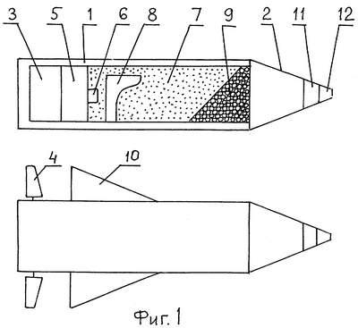Снаряд для гладкоствольной танковой пушки (фиг.1) с аэродинамическим управлением по крену выполнен по нормальной аэродинамической схеме (крылья впереди, рули сзади). Снаряд содержит корпус 1 и головной колпак 2. В задней части корпуса расположен отсек управления 3 (автопилот) с выдвижными рулями 4, временной взрыватель 5 с детонатором 6, в передней части корпуса заряд ВВ 7 с взрывонепроводящей вставкой 8, формирующей детонационный фронт, и осколочный блок 9, выполненный из ГПЭ. В данном случае осколочный блок выполнен в форме усеченного круглого цилиндра.