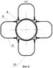 1 – маршевая ступень, 2 – реактивный двигатель, 3 – арочные лопасти, 4 – шарниры, 5 – проушины, 6 – основание, 7 – кормовая часть двигателя, 8, 9, 10 – поверхности арочных лопастей.