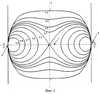 Фиг.1, 2, 3 и 4 поясняют конструкцию предлагаемого устройства. На фиг.1 изображены линии равного значения поверхностной весовой функции (эквипотенциальные линии) электромагнитного расходомера для плоскости, расположенной по оси канала и линии, соединяющей центры электродов. Поверхностная весовая функция имеет две особые точки (1 и 2), в которых сходятся все эквипотенциальные линии поверхностной весовой функции электромагнитного расходомера. Эти особые точки находятся в местах расположения электродов. Линия 3 проведена через особые точки поверхностной весовой функции. На фиг.2 изображена одна секция индукционной катушки, выполненная в виде двухзаходной спирали, части которой соединены между собой с помощью проводника, обозначенного пунктиром. H1 и К1 соответствуют началу и концу первой части двухзаходной спирали, а Н2 и К2 соответствуют началу и концу второй части двухзаходной спирали. Линия 6 соответствует линии, соединяющей особые точки поверхностной весовой функции, и ограничивает расположение витков секции, проведенных по линиям равного значения весовой функции. Площадь витков, занимаемых секцией, условно можно разделить на две части: рабочую площадь 4, которая на фиг.2 расположена выше линии, соединяющей особые точки поверхностной весовой функции, и служебную 5, которая расположена ниже линии, соединяющей эти особые точки. В рабочей площади значительная часть проводников проведена по линиям равного значения поверхностной весовой функции, а в служебной площади нет проводников, проведенных по линиям поверхностной весовой функции, а все они выполняют служебную роль и необходимы для последовательного соединения всех витков секции. На фиг.3 приведена третья (дополнительная и в некоторых случаях необязательная для применения) секция катушки, предназначенная для компенсации влияния магнитного поля, проникающего через служебную часть площади витков первой и второй секций и наводимого магнитным полем паразитной ЭДС. Линия 7 нанесена на секции для ориентации секции при установке в канале расходомера. Третья секция катушки применяется в том случае, если величина паразитной ЭДС превышает допустимую величину. Такой случай может создаться, если катушка изготовлена для поверки электромагнитных расходомеров относительно небольших размеров, например с диаметрами 200-300 мм. У катушки для расходомеров большего диаметра относительная величина служебной площади к рабочей становится все меньше и меньше, и необходимость в применении третьей секции отпадает. Третья секция образуется соединительными проводниками, повторяющими аналогичные проводники, расположенные на служебных площадях секций. Суммарная площадь витков этой секции равна сумме площадей витков, образуемых служебными площадями первой и второй секции. Третья секция выполняется также в виде плоской платы. При применении третьей секции она соединяется последовательно с первой и второй секциями и включается по наведенной в ней ЭДС навстречу им. Таким образом, суммарная величина паразитных ЭДС, наведенных в части витков первой и второй секций, расположенных на служебных площадях обеих секций, компенсируется ЭДС, наведенной тем же магнитным полем в третьей секции катушки.