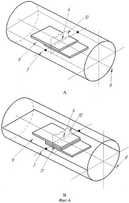 На фиг.4 изображены два варианта положений секций катушки в канале расходомера. Первый вариант (А) основной, соответствует случаю, когда третья секция не используется. В этом случае основные секции катушки располагаются в канале расходомера в плоскостях, параллельных плоскости 9, проходящей через ось канала 8, и линию, соединяющую центры электродов 3, таким образом, что линия 3, соединяющая электроды и линии 6 каждой секции, находятся в плоскости 10, перпендикулярной оси канала 8. При этом секции касаются друг друга по плоскости 9 и соединены между собой последовательно и согласно.