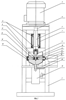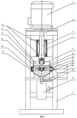С помощью подъемного механизма 19 стол 1 с емкостью 13 вместе с собранным внутри нее испытательным узлом 8 перемещают вверх до тех пор, пока концевая конусная часть вала 9 плотно не войдет в ответное конусное углубление приводного вала 5 для соединения их между собой, например по типу, используемому в сверлильных станках для крепления хвостовиков сверл. В обойму 12 устанавливают термопару 23, а в емкость 13 заливают испытательную жидкость до уровня выше верхнего торца внутренней втулки 10 испытываемой пары трения. После этого в емкость 13 снизу через штуцер 24 подают сжатый воздух. Поскольку по условиям испытания в испытательную жидкость добавляется в заданном количестве абразивный порошок, продувка испытательной жидкости воздухом необходима для равномерного распределения абразива в жидкости.