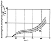 На фиг.3 приведены в качестве примера нормированные температурные приращения тензорезисторов, наклеенных на композиционном материале, и допустимые их предельные отклонения t с учетом ориентации армирующих волокон.