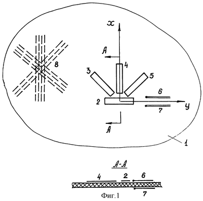На фиг.1 приведена схема размещения на конструкции 1 термостойких тензорезисторов 2, 3, 4, 5 и термодатчиков 6 и 7 с учетом направления укладки армирующих волокон 8.