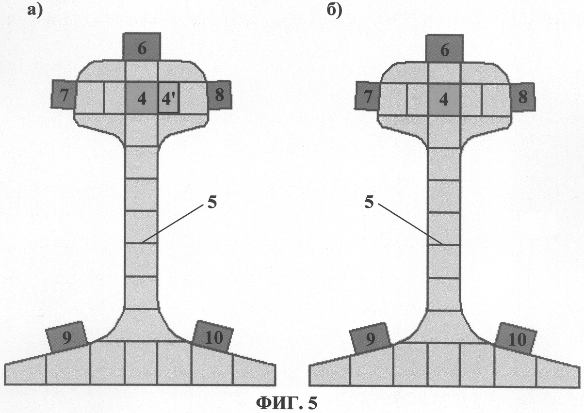 Измерительный блок представляет собой конструкцию, объединяющую несколько измерительных элементов, с возможностью их плотного прилегания к поверхности рельса для обеспечения акустического контакта. Измерительные элементы содержат один или два УЗ-преобразователя. На выбранные участки поверхности рельсов в области сварного стыка устанавливают несколько УЗ измерительных блоков. Сложный профиль рельса, например, может потребовать, фиг. 2, наличия УЗ измерительных блоков на поверхности катания рельса 6, на боковых стенках головки 7 и 8, а также на перьях подошвы рельса 9 и 10. Каждый измерительный элемент имеет схемы прозвучивания, позволяющие ему обнаружить дефекты определенных свойств в заданной зоне сварного стыка рельсов. Например, УЗ измерительный блок 6, фиг.1, установленный на поверхности катания рельса 5, состоит из трех УЗ-преобразователей 1, 2 и 3, образующих два измерительных элемента. Первый – состоит из одного УЗ-преобразователя 1 и имеет схему прозвучивания, направленную вдоль оси сварного шва. Второй измерительный элемент содержит два УЗ-преобразователя 2 и 3 и может использовать несколько схем прозвучивания 2 3, 3 2, 3 3,1 1 для обнаружения дефекта 4 эхо- или зеркальным (тандем) методами ультразвукового контроля [1]. Каждая из схем эффективна для обнаружения дефекта определенной ориентации и свойств. Для прозвучивания всей вертикальной оси симметрии сварного стыка необходимо установить несколько измерительных элементов, фиг.3, со схемами прозвучивания, аналогичными описанным, но направленным на разные по высоте части.