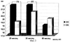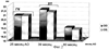 2. Пациентка Б., 35 лет, у которой диагноз ДТЗ был установлен впервые 5,5 лет назад, отметила появление выраженных жалоб со стороны глаз на 1 год позже тиреотоксических. Доминирующими жалобами были непостоянное двоение, утомляемость глаз, выраженное слезотечение и светобоязнь. При определении суммарного содержания уроновых кислот до назначения лечения мы получили результат – 7,12 мг/сутки. Согласно нашей методике, прогнозируется неблагоприятный тип течения (рецидивирующий или прогрессирующий). Был назначен преднизолон 45 мг перорально с постепенным снижением дозы. Поскольку после отмены преднизолона содержание в сточной моче уроновых кислот превышало 3,0 мг/сутки (результат – 4,38 мг/сутки), в дополнение к преднизолону мы назначили лучевую терапию на область орбит в суммарной дозе 16 грей. Результат содержания суммарного количества уроновых кислот после комбинированной иммуносупрессии – 2,16 мг/сутки. И, как мы увидели в дальнейшем, у пациентки наступила стойкая ремиссия АО. На фиг.2 показана динамика мышечного индекса, а на фиг.3 – динамика экзофтальма на фоне проведенной иммуносупрессивной терапии глюкокортикоидами (ГК) на 25-м месяце течения АО, лучевой терапии на область орбит (ЛТ) на 39 месяце течения; причем OD (темные столбики) обозначают динамику со стороны правого глаза, a OS (светлые столбики) – со стороны левого глаза.